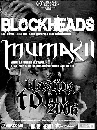 MUMAKIL enfin vient décharger sa hargne, voir si on peut faire autant de bruit à 4 qu’à 5 ! C’est un très bon show auquel on a droit, plein de hurlements de gorets façon Gore/Grind. Les fans du groupe, arborant tee-shirts de rigueur ont été copieusement servis. L’ambiance n’est pas retombé jusqu’à l’extrême fin, pour laquelle les genevois ont interprété un standard Punk, qui a fait revenir Xav’ des coulisses pour un dernier tour de scène. Inutile de dire que les slammers s’en sont donné à cœur joie. Bref mais intense ce Blasting Tour a fait fureur dans la salle, on espère que l’expérience ce poursuivra ! Huit dates attendaient encore BLOCKHEADS et MUMAKIL, première expérience de tournée pour les Français qui se demandaient dans quel état ils finiraient.