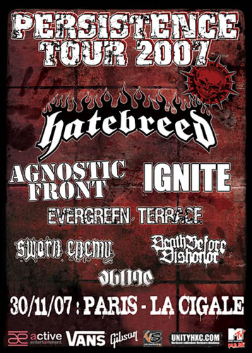Il est rare qu’une salle aussi prestigieuse et aussi bien agencée que la Cigale ouvre ses portes pour accueillir un festival de Hardcore de plus de 5 heures et accueillir autant de groupes reconnus pour un festival de ce genre commençant tout de même à 17h00 pour se finir vers 22h40. pour se genre d’évènement, on est plutôt habitué à l’Elysée Montmartre ou bien au bon vieux club Dunois dans le 13ème, un des haut lieu des bons vieux concerts de Hardcore suintant bien la sueur et la bière ! Au début, vu les horaires de la programmation, nous avons comme une drôle d’impression, celle de se rendre à une «boom» qui commence en fin d’après midi pour voir les copains et pour boire un petit coup de jus de pomme ! Pour tout bon fan de Hardcore US qui se respecte, le Persistence Tour 2007 à Paris ne pouvait s’éviter. Metal-Impact se devait de faire acte de présence pour assister à un show haut en couleur et en démonstration de styles. Demonstrating My Style comme dirait un certain Freddy Cricien de MADBALL… Une affiche ô combien aguichante est là pour attirer un maximum de spectateurs : de SWORN ENEMY à IGNITE en passant par les vétérans AGNOSTIC FRONT pour finir avec la tête d’affiche, les hommes du Connecticut HATEBREED. Normalement ce sont les américains de DEATH BEFORE DISHONOUR qui devait ouvrir le bal mais une annulation de dernière minute comme il y en a souvent annule leur passage. Ce sera RINGWORM qui ouvrira les hostilités dans cette superbe salle de la Cigale se prêtant magnifiquement à ce genre de représentation scénique. Un début de show aux alentours de 17h30 avec un public clairement clairsemé dans les diverses appendices et couloirs de notre amphitryon d’un soir. Un premier étage se remplissant très doucement alors que sur la droite de la scène un stand où se trouvent les produits dérivés des différents groupes du soir est squatté par les spectateurs avec un bon gobelet de bière à la main. Les mezzanines, lieu où je me trouve pour avoir un meilleur visu du concert, de la scène et de la fosse, pour affiner mon analyse sociologique est le lieu idéal pour suivre le concert. Allez, c’est parti !