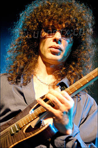 HERVE N'KAOUA est un pianiste classique avec lequel Patrick a enregistré un disque intéressant il y a peu, confrontation peu commune de deux interprétations de la « grande musique ». Les deux compères vont jouer deux titres sur scène, « Kreisler » et une reprise de « Mindscape » (avec Philippe Maullet, le batteur de l' « Amphibia Tour », 1997). Si l'idée est bonne, et l'intention plutôt louable, le résultat n'est pas à la hauteur des espérances, le son et le matériel du soir ne rendant pas hommage à la qualité des musiciens dans le cadre de ce duo. S'ensuit le titre « Backhand » (toujours issu de Amphibia), avec Phil Woindrich aux claviers, puis le surpuissant « Burnout » sur lequel ce dernier peine à trouver les accords par moments, ce qui donne lieu à quelques grimaces amusantes, sans qu'on ne note toutefois d'erreur majeure. Un beau moment de convivialité, au cours d'un titre très populaire sur lequel le public ne boude pas son plaisir.