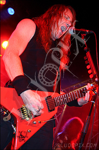 Ramon R. Messina s’est fait remplacer sur cette date, son indisponibilité est plus longue que prévue. Alessandro Conti de TRICK OR TREAT sera le frontman de la soirée, à noter sa démarche avenante, invitant le public à se manifester sur chacun des titres. Les fans italiens présents dans la salle donnent de la voix. Alessandro a besoin de se rassurer en lisant les paroles de certains titres sur son prompteur. Le bassiste, qui n’est pas sans nous faire penser à Mister T. ne passe pas inaperçu et capte bien l’attention du public. Sur la fin de la prestation, Alessandro Conti, fait un petit clin d’œil à sa compatriote, aujourd’hui première dame de France, en prenant une petite voix de mijaurée en évoquant Carla Bruni.