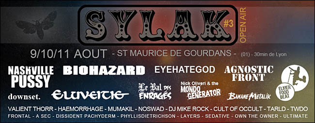 Effectivement, déjà la troisième occurrence pour le seul festival Metal d'été de la région Lyonnaise. Les deux dernières éditions avaient largement tenus leurs promesse, en offrant aux quelques 1500 festivaliers présents un festival à taille humaine, à l'ambiance très conviviale et familiale (peu de festivals Metal peuvent se vanter d'avoir fait venir BERNARD MINET et CORBIER... Cette année, la grosse blague – dans le bon sens du terme – de l'affiche venait de Nantes et se prénommait ELMER FOOD BEAT... Quoi, vous ne vous rappelez pas de ce refrain intemporel qu'est « Le plastique c'est fantastique / Le caoutchouc super doux ! » ?) et à l'affiche composée d'une trentaine de groupes sur un vendredi soir et un week end. En 2011 et 2012, l'organisation du Sylak avait essentiellement misé sur une programmation en grande majorité composée de groupes Français, aussi bien des références en dehors de nos frontières (DAGOBA, LOUDBLAST, DESTINITY, ETHS, TAGADA JONES...) que des groupes en devenir (SKOX, DEMENTED, OIL CARTER...), avec malgré tout la venue de quelques mastodontes qui sont devenus des légendes, notamment NAPALM DEATH, tête d'affiche de l'année précédente.