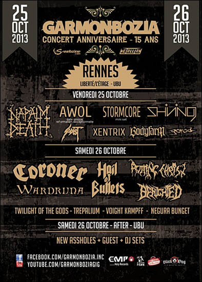 Ce samedi 26 Octobre 2013 est la seconde soirée d’anniversaire (15 ans) de l’association Garmonbozia. Les festivités avaient vraisemblablement déjà bien commencé hier avec une affiche plus qu’attractive (NAPALM DEATH, SHINING (Norvège), GOROD, etc.) et ce soir promet d’être de toutes évidences une bien belle clôture à cet évènement.