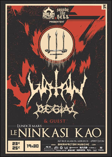 Entres les Vormela Black Fest, SHINING, Black Arts Ceremony et autres BEHEMOTH, on ne peut pas dire que la communauté Black Metal de la région lyonnaise n’est pas gâtée. Et comme il vaut mieux plus que pas assez, un petit voyage en Suède, berceau éternel de l’Art Sombre, aura été proposé au Ninkasi Kao en ce lundi de mars. WATAIN, devenu en quelques années un groupe incontournable, sur les routes depuis août pour défendre son dernier manifeste diabolique The Wild Hunt, a fait halte au Ninkasi Kao de Lyon, salle où ils s’étaient produits quatre années auparavant, accompagnés par DESTROYER 666 et OTARGOS. Si vous lisez régulièrement mes articles dans les pages de Metal-Impact, vous savez sans doute que WATAIN, je suis plus qu’archi-fan. Cette soirée, ce dépucelage live, autant vous dire que je l’attendais depuis un long moment. Mais trêve de pleurnicheries émues. Les portes s’ouvrent pour laisser rentrer les quelques 200/220 personnes qui auront fait le déplacement. Encore une fois, ça sera l’occasion de pousser un véritable coup de gueule quant à la désaffection des salles de concert dans la région. Ce seront les fidèles au poste et les plus acharnés qui, une fois n’est pas coutume, auront répondu présent.