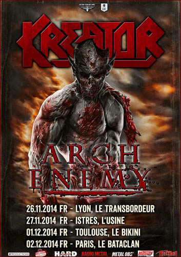 Depuis septembre, le programme des concerts à Lyon et ses environs est pour le moins fourni. A tel point qu'on ne sait plus vraiment où donner de la tête ! Prenez cette semaine du 21 au 28 novembre 2014 par exemple : rien que là, on a pu encaisser DARKENHOLD pour sa première venue dans la région, SAXON pour les plus fatigués, ELLENDE afin d'avoir le quart d'heure hippie de la semaine et le cas qui nous intéresse ici, c'est les seigneurs de KREATOR accompagnés d'ARCH ENEMY pour la première date de leur tournée européenne commune. L'occasion de se rendre dans la très belle salle du Transbordeur pour écouter une des légendes incontestées du Thrash mondial aura suffi à motiver de nombreux pèlerins, même si le dernier passage de la troupe de Mille Petrozza en ces lieux date de seulement deux ans et deux semaines pile. Une date de ce format ci, avec de grosses têtes d'affiches très "mainstream" est tout de même un évènement notable, dans la mesure où les nombreuses petites et moyennes associations dans les alentours sont très nombreuses à organiser des concerts aux affiches plus axées underground (non pas que l'on s'en plaigne, loin de là !), et ce beaucoup plus régulièrement que des évènements plus faciles d'accès. Comme par exemple ce plateau proposé ce soir par Mediatone, organisation très fertile, qui donne naissance à des soirées et à des concerts de tous les genres sur Lyon.