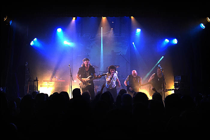 Sans fioritures le groupe débarque dans une belle ambiance, et envoie une bonne dose de son Heavy Metal old-school avec deux grosses tartes : "Tourmente et Passion" et "Notre-Dame de Paris". Le son est clair, bien que très fort, et les deux guitares balancent d'emblée des riffs agressifs et lourds qui enfoncent dans nos oreilles un message bien net : on va morfler. Une heure durant, à fond la caisse, ADX va donner à son public ce qu'il est venu chercher. Du bon gros Metal qui tâche. Au milieu de la salle se forme un mosh pit du plus bel effet, et les "stage divers" bas de plafond se succèdent, surfant sur une marée déchaînée de rockers gominés. J'aime assez le trip revival, après tout c'est dans les vieux pots qu'on fait la meilleure soupe parait-il. Mais là je ressens comme une gêne...