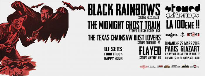 Ce dimanche, les Stoned Gatherings (organisateurs de concerts Stoner, Doom, Sludge à Paris) fêtent dignement leur centième avec une affiche généreuse en grosses bûches. Quatre groupes sont attendus sur la scène du Glazart. Dans cette ancienne gare routière de la petite ceinture parisienne, le gros son ne risque pas de gêner les voisins ! Et du gros son, le public va en manger. Entre le Classic Hard Rock de FLAYED, le Stoner Spaguetti de TEXAS CHAINSAW DUST LOVERS, le Heavy Blues de THE MIDNIGHT GHOST TRAIN et le Heavy Psych de BLACK RAINBOWS, la soirée promet d'être éclectique... mais surtout elle s'annonce bien Heavy.