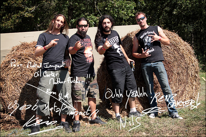 C'est en ce dernier jour de Motocultor cuvée 2012 que les Toulonnais d'OIL CARTER on accepté de répondre à nos questions, seulement deux heures après leur passage remarqué sur la Supositor Stage où ils ont distillé leur Heavy / Rock aux riffs énergiques et leur bonne humeur aux festivaliers présents lors de leur prestation. Un grand merci à OIL CARTER pour leur bonne humeur, leur simplicité et le temps qu'ils m'ont accordé.