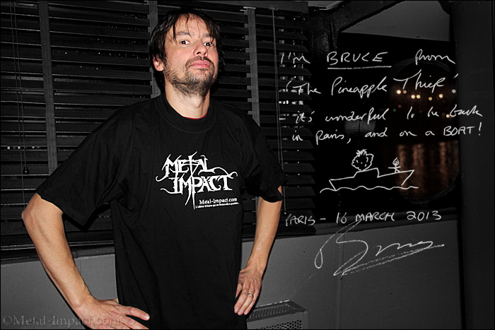 THE PINEAPPLE THIEF est le projet d’un seul homme, Bruce Soord qui, à force d’abnégations et de persévérance a réussi à abattre des montagnes pour émerger sur la scène internationale. Le bougre a connu des années très difficiles, seule sa passion et sa foi dans THE PINEAPPLE THIEF l’on guidé afin de mener son aventure jusqu’au bout ! Un vrai sacerdoce qu’il a mené en solitaire ! Car le garçon est un véritable homme orchestre très doué, capable de tout faire ou presque. L’histoire commence en 1996, lorsqu’avec Neil Randall il décide de créer VULGAR UNICORN, une expérience qui ne s’avérera pas concluante et qui lui laissera un goût amer ! C’est seul qu’il décide de poursuivre l’aventure. Notre ermite baptise son nouveau gang THE PINEAPLE THIEF et s’enferme dans son studio pour composer ce qui allait devenir Abducting The Unicorn. Il trouve très rapidement un deal avec un petit label du nom de Cyclops Records qui va lui permettre de s’exprimer en toute liberté. Il va d’ailleurs mettre toute son énergie afin de concocter son premier méfait qui sort en 1999. Fait très rare, il joue de tous les instruments et s’occupe aussi du mixage et du mastering ! Le méfait sort en 1999 et malgré une distribution très discrète, il lui permet de se créer un petit cercle de fans très dévoués. La Hollande sera un des premiers pays à l’adopter. Il enchaine immédiatement avec une deuxième galette 137 qui, cette fois-ci, sera enregistrée avec l’aide d’un producteur. Le résultat sera significatif, les morceaux seront plus sophistiqués et la production nettement supérieure, Bruce Soord continuant d’assurer toutes les parties musicales seul. Il en sera de même pour le troisième opus, Variation On A dream, qui sera la meilleure vente du label. Cette fois-ci, THE PINEAPPLE THIEF se doit de donner des concerts et Bruce Soord va se mettre en quête de musiciens pour l’accompagner. THE PINEAPPLE THIEF devient dès lors un véritable combo, une décision qui sera fondamentale pour la suite de l’aventure. 12 Stories Down sort en 2004 mais le son n’est pas à la hauteur des espérances de Bruce suite à un mastering catastrophique, la distribution sera arrêtée immédiatement. Notre ami reprendra le projet entièrement durant de long mois. Au final, le résultat sera 10 Stories Down qui déboulera dans les bacs en 2005. 2006 sera une année importante pour le combo, Bruce s’attaque à l’enregistrement de Little Man, un opus fort émotionnellement suite à un drame personnel qui le traumatisera à jamais .C’est à cet époque qu’il sera remarqué par Steven Wilson qui, dès lors, deviendra un fan absolu de THE PINEAPPLE THIEF. D’ailleurs, il sera d’une aide précieuse pour la suite du déroulement de la carrière du gang. Les lascars signent en 2008 avec le label Kscope qui va véritablement leur permettre de prendre leur envol. Tightly Unwound sort la même année et montre une métamorphose musicale vers un style nettement plus rock ! Mais le choc va se produire deux ans plus tard avec Someone Here Is Missing, une vraie pépite progressive rock à tendance Metal qui crée la surprise par sa qualité. Le doute n’est plus permis, THE PINEAPPLE THIEF vient jouer dans la cour des grands aux cotés de PORCUPINE TREE, ANATHEMA et consorts. Les anglais se sont même permis le luxe de travailler avec Storm Thorgerson, un monstre sacré du graphisme qui a œuvré pour LED ZEPPELIN ou PINK FLOYD pour n’en citer que quelques uns. La pochette sera une véritable réussite ajoutant du mystère autour du groupe. Ils enregistreront d’ailleurs une reprise de « money » en 2011, petit hommage en passant au Flamand Rose. La tournée européenne sera une réussite et nos britishs en profiteront pour sortir un Ep, Someone Here Is Live, qui sera un témoignage des plus efficaces de leurs concerts. Conscient qu’ils sont cette fois soutenu par une maison de disque qui croit en eux, ils enchainent avec All The Wars qui ne fera que confirmer que leur mutation vers un Pop Rock Alternatif. Là encore c’est un vrai succès. Profitant de leur passage à Paris au Batofar en ce samedi pluvieux de mars, c’est après une balance interminable que votre serviteur a pu s’entretenir avec Bruce Soord, leader et créateur de la formation britannique THE PINEAPPLE THIEF afin d’en savoir un peu plus sur le parcours chaotique de cette nouvelle révélation de la scène Metal Progressive. Rencontre avec un musicien fatigué mais heureux de jouer dans la capitale.