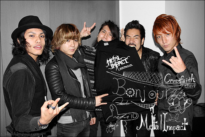 CROSSFAITH est un véritable Ovni sur la scène musicale qui nous arrive directement du Japon, plus précisément d'Osaka. Le groupe a déjà trois albums à son actif en huit ans d'existence. Véritable phénomène au pays du soleil levant où ils enchainent les concerts sold out, les CROSSFAITH demeurent encore relativement inconnu dans l'hexagone, certainement pas pour longtemps. Ils pratiquent un Metalcore à tendance électro voir Dubstep des plus efficaces et fortement influencés par SLIPKNOT et PRODIGY dont ils ont d'ailleurs repris Omen dans une version métallisée du plus bel effet. Un mélange explosif qui semble leur réussir à merveille. Si pendant de nombreuses années le gang est resté cloitré dans son pays, depuis 2011 et la sortie de leur second opus (The Dream, The Space), les choses semblent avoir évolué de manière significative. Grâce à une tournée européenne aux côtés de MICE AND MEN et BURY TOMORROW ainsi que d'autres dates en Special Guest de BRING ME THE HORIZON ou encore WE BUTTER THE BREAD WITH BUTTER, nos nippons ont réussi à se faire remarquer sur le vieux continent et notamment en Angleterre. La Sortie mondiale de l'Ep Zion le 4 février 2013 leur a permis de jouer aux Etats-Unis ainsi qu'en Australie et de conquérir de nombreux fans par la même occasion. Pour leur troisième méfait, nos amis nippons ont placé la barre très haute en allant enregistrer avec Machine à New York. Un producteur qui a notamment travaillé avec des combos comme LAMB OF GOD ou EVERY TIME I DIE. Le résultat est exceptionnel, Apocalyse est doté d'une production monstrueuse qui regorge de titres très accrocheurs comme Eclipse ou Evolution qui sont prédestiné à squatter les charts du monde entier grâce à leur côté catchy envouteur, une vraie bombe Electro Metal. Si vous ajoutez à cela une signature chez Sony, il est évident que les bougres n'ont rien laissé au hasard et se sont donnés les moyens de s'imposer sur la scène mondiale. C'est à l'occasion de leur passage à Paris que MI a rencontré le gang au grand complet pour le soumettre à la question et en savoir un peu plus sur leur nouvelle pépite Apocalyse. Rencontre sympathique avec une bande de joyeux lurons visiblement très heureux d'être à Paris et de pouvoir présenter leur petit dernier à la presse ! Magnéto, c'est à vous les gars !