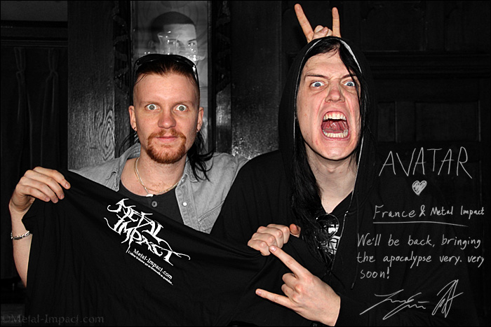 AVATAR un nom qui ne vous dit peut être rien pour l'instant car ils demeurent relativement inconnus en France mais cela ne saurait tarder. Rassurez-vous rien à voir avec James Cameron et son film bien que l'amalgame soit facile. Ici il s'agit d'un combo suédois qui s'est formé en 2001 et qui pratique un Death mélodique technique des plus efficaces. Bien que le gang ait déjà un long parcours derrière lui, il aura fallu attendre Black Waltz paru en 2012 pour que les choses s'accélèrent et leur permette d'atteindre un nouveau statut des plus enviables. Une évolution musicale saluée par la presse qui s'est aussi accompagnée d'un changement radical de look. Une véritable métamorphose qui semble leur réussir à merveille au vu de la qualité de leur deux derniers méfaits. L'idée de génie est d'avoir créé un personnage de clown malsain et glauque inspiré directement de l'univers du cirque et que l'on pourrait croire tout droit sorti du cultissime film américain Freaks. Un vrai must qui leur a permis de se démarquer et d'éviter d'être noyé au sein de la scène Death issus de Göteborg. Nos suédois conscient qu'ils ont trouvé un filon inépuisable n'hésite pas à mettre en scène ce monde noir et inquiétant grâce à des clips plus barré les uns que les autres comme "Hail To The Apocalyse" ou "Bloody Angel" filmé en noir et blanc histoire de rajouter un petit côté morbide à l'affaire, on n'est pas loin visuellement de Georges Méliès. Le clown au sourire machiavélique se taillant bien évidemment la part du lion. Cette nouvelle orientation visuelle et musicale leur a notamment permis d'ouvrir pour AVENGED SEVENFOLD aux côtés de FIVE FINGER DEATH PUNCH et de triompher au Zénith en novembre dernier. Après le succès de Black Waltz en Europe mais aussi aux Etats-Unis ou AVATAR a pu ainsi voir plusieurs de ses single se hisser dans les charts US, nos lascars sont partis en Thaïlande afin d'y enregistrer son digne successeur sous la houlette de leur producteur fétiche Tobias Lindell. On ne change pas une équipe qui gagne. Le résultat est à la hauteur de nos espérances et Hail To The Apocalypse s'avère être une véritable réussite tout en étant dans la continuité de son prédécesseur. La prise de risque est réelle, le combo n'hésitant pas à insérer des refrains plus pop et très accrocheurs allié à des rythmes Rock qui se fondent à merveille dans un moule typiquement Death Metal suédois, un pas de géant qui leur confère désormais une réelle originalité. Un défi réussi haut la main qui confirme qu'AVATAR est prêt à s'évader du carcan Metal extrême même si il risque de dérouter ses fans de la première heure. C'est lors de leur passage à Paris que votre serviteur a pu passer au grill les deux membres fondateur : Johannes Eckerström (le chanteur au masque de clown) et John Alfredsson qui officie derrière les futs. Entretien avec deux personnages sympathiques et détendus qui cette fois-ci se présentent sans masques et savourent le succès qui semble leur ouvrir les bras. Magnéto les gars, c'est à vous !