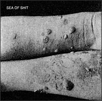 Mais que ça ne vous empêche pas d'y jeter une oreille, comme au reste de leur discographie bien sur. Car dans le créneau surchargé du Powerviolence, SEA OF SHIT reste une valeur sure, avec des qualités qui leur sont propres. Evidemment, Sea of Shit n'est que violence, riffs sombres, blast explosifs, mais l'énergie dont fait preuve le quintette n'a d'égal que leur créativité. Ils parsèment en effet leurs compos de petites trouvailles bien senties qui boostent parfois des titres pourtant très courts. Leur brièveté est d'ailleurs assez régulière, puisque chaque morceau frise la minute ou la dépasse à peine. Mais même dans ce format restreint, SEA OF SHIT ne se contente pas de balancer du Crust/Grind routinier, et multiplie les changements de tempi, trouve des breaks encore plus ébouriffants que le thème principal, et reste toujours ludique. Certes, l'ambiance générale est bien plombée, les guitares ne sont pas là pour amuser la galerie, mais cette belle dynamique vous enfonce petit à petit dans un sol mouvant, dont ils sont les seuls à connaître les pièges. Ainsi, "Pedestal" s'amuse à souffler le bouillant et le gelé, "Untold Beatings" prend le contre-pied d'une pesanteur glauque pour soudain briser les codes de vitesse, tout comme "Distorted Image" qui continue de rester collé à une basse gluante et distordue à l'extrême.
