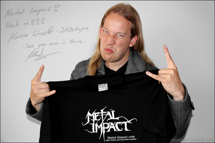 21OCTAYNE voilà un nom original qui, s'il a le mérite d'être mystérieux, n'en ai pas moins des plus difficile à retenir. Peu importe car le combo avec un seul album à son actif suscite déjà l'intérêt de tous les médias. Il faut dire que le gang est constitué d'une pléiade de musiciens ayant déjà un passé très chargé et qui malgré leur jeune âge font déjà office de vétéran du Metal ! 21OCTAYNE nous vient d'Allemagne même si le line-up a un petit côté international notamment grâce à son chanteur Hagen Grohe originaire des Etats-Unis. Certains qualifient déjà la formation allemande de super méga groupe vu la qualité des musiciens en son sein. Le combo pratique un Hard Rock fortement inspiré par les seventies, une sorte de Big Rock version teutonne ou l'improvisation est un élément clef et fondateur. Un cocktail détonnant ou le coté prog/pop s'allie à de grosses guitares puissantes et très Hard Rock. Cette diversité étant dûe essentiellement au fait que chaque membre de la formation vient d'un univers musical qui lui est propre, ce qui leur donne une identité très forte. Formé en 2008 à l'initiative de Marco Wried (AXXIS) et Alex Landenburg (RHAPSODY OF FIRE, STRATOVARIUS, SYMPHONIA, MASTERPLAN), la formation sera très vite rejointe par Andrew Lauer (Paul Gilbert) ce qui leur permettra de composer de nombreux morceaux en un temps record après des jams très prolifiques inspiré par leurs racines seventies. L'idée étant au départ de créer un trio instrumental, une originalité qu'ils abandonneront très vite ! Fort de leur potentiel, nos trois lascars décident alors de chercher un autre compère pour assurer le chant. Par chance, ils trouvèrent rapidement la perle rare en la personne de Hagen Grohe, chanteur des plus doué qui officie au sein du Joe Perry Project et dont la réputation n'est plus à faire. Une vraie bénédiction tant la voix complète à merveille leur horizon musical, une union parfaite. Cerise sur le gâteau, le bougre vit en Allemagne malgré le fait qu'il soit de nationalité américaine. Un plus pour 21OCTAYNE dont l'objectif est tout simplement la conquête absolue du monde. La boucle est bouclée et nos teutons s'enferment très rapidement en studio avec un producteur dont le nom sera gardé secret pour enregistrer ce qui aurait dû être leur premier album, le résultat malheureusement ne sera pas concluant et contribuera à ralentir la machine lancée à pleine vitesse. N'étant pas satisfait de la production de la galette, nos amis n'hésitent pas à le faire passer à la trappe et s'empressent d'en enregistrer une nouvelle version où ils se chargent cette fois-ci de la production. Le résultat est à la hauteur de leurs espérances tant Into The Open est une réussite haut de gamme qui nous propose un mélange de styles toujours très mélodiques et ou les refrains vous scotchent les neurones pour ne plus vous lâcher. Le tout relevé par une performance ultra efficace vu le niveau de nos pointures d'Outre Rhin. L'avenir semble radieux pour les 21OCTAYNE qui s'imposent dès leur premier méfait comme une valeur sûre sur laquelle il va falloir compter à l'avenir. Il n'en fallait pas plus pour que votre serviteur se précipite à la rencontre de Marco Wried, un des membres fondateur qui officie comme guitariste au sein de 21OCTAYNE. Entretien fleuve avec un Marco jovial, très bavard et heureux d'être de retour dans la capitale. Visiblement très motivé par cette nouvelle aventure, notre ami n'hésite pas à nous éclairer sur toute la genèse de Into The Open et bien plus. Magnéto Marco, c'est à toi !