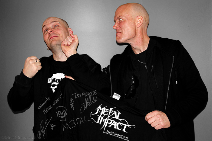 Si TAD MOROSE a démarré sa carrière sous des hospices très prometteurs, la suite n'a malheureusement pas été à la hauteur de leurs espérances. Leur parcours a été plus que chaotique, à tel point que cela tient du petit miracle si nos suédois soit encore en activité de nos jours. Le combo s'est formé en 1991 et semblait pourtant être promis à un bel avenir. Dès le premier opus, Leaving The Past Behind, TAD MOROSE se fait remarquer par son Metal atypique et malsain. Fort de ce fait, nos amis vont enchainer les galettes sans jamais baisser les bras malgré de graves problèmes de line-up. Une instabilité qui sera un énorme handicap pour le gang en quête de reconnaissance. Ils réussiront tout de même à graver quelques pépites qui resteront dans les annales à l'instar d'Undead ou Modus Vivendi. Une époque bénie où tout semble aller pour le mieux, les tournées s'enchainant que ce soit en première partie de DEMON ou d'EDGUY. TAD MOROSE écumera une bonne partie de l'Europe réussissant ainsi à se créer un following d'irréductibles ! Pourtant, les problèmes internes viendront une fois de plus ralentir la machine. Cette fois, c'est Urban Breed qui en 2005 quitte le vaisseau après neuf longues années de service, il est remplacé immédiatement par Joe Comeau, véritable vétéran du Metal, qui a sévis au sein de groupes aussi divers que LIEGE LORD, ANNIHILATOR ou encore OVERKILL. Une référence vocale qui, malheureusement, ne pourra pas rester pour des raisons évidentes de distance car le bougre réside aux USA. Tous ces errements se solderont par une absence de dix ans, une disparition qui aurait pu leur être fatale. La formation se fera très vite jeter par Century Media lassé d'attendre un hypothétique album qui ne vient jamais dans les délais raisonnables. Il faudra à Christer Anderssson et Peter Morén tout ce temps pour remettre à flot un navire qui prenait l'eau de toutes parts. Une convalescence longue et difficile pour une résurrection surprenante que l'on attendait plus. Finalement, l'arrivée de Ronny Hemlin (STEEL ATTACK) et de Kenneth Jonsson (TORCH) sera décisive pour stabiliser enfin TAD MOROSE et leur permettre d'enregistrer leur nouvel opus dans un climat serein. Revenant déboule dans les bacs en 2013 et est une véritable surprise à laquelle personne ne croyait plus. Un vrai petit miracle en quelque sorte quand on connait le parcours apocalyptique de TAD MOROSE ces dernières années. TAD MOROSE est bien vivant et affiche même une forme olympique aux yeux de tous, les déboires internes semblent cette fois-ci bien loin et l'optimisme est de rigueur. Ils effectuent un retour très réussi en nous proposant un Heavy Metal mélodique à l'ancienne fortement influencé par les eighties mais qui reste bougrement efficace. Un retour en force rivé à leur identité musicale, histoire de bien remettre les pendules à l'heure. Il n'en fallait pas plus pour que MI prenne un rendez-vous avec Christer "Krunt" Andersson et Ronny Hemlin dans un hôtel parisien afin d'en savoir un peu plus sur ces dix longues années d'absence. Entretien avec des musiciens quelque peu fatigué après une soirée bien arrosée la veille mais toujours disponibles pour nous dresser un historique rapide. Un peu confus de ces dix dernières années, ils nous expliquent la genèse de Revenant ! Magnéto les gars, c'est à vous !