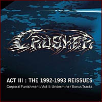 Act III : The 1992-1993 Reissues propose donc sur un même support les deux albums de CRUSHER, Corporal Punishment sorti en 1992, ainsi que Act II : Undermine, agrémentés de quelques bonus tracks. Outre le digipack soigné, avec un joli livret résumant les années d'activité du groupe, c'est surtout l'occasion de se replonger dans les premières années de la décennie 90, riches en débordements Death et autres exactions à la limite du Grind. On a abondamment parlé à l'époque de ce séminal premier effort qui avait fait grand bruit. Après des années de répétitions et de petits concerts, CRUSHER s'attaquait enfin au marché européen avec un premier effort aux consonances encore largement influencées par la scène Death US et Nordique, mais aussi par les inflexions bruitistes purement anglaises.